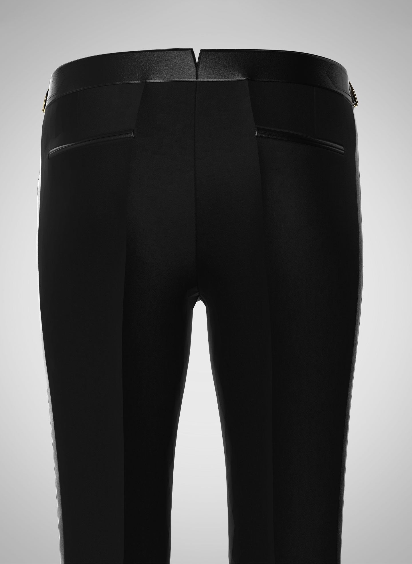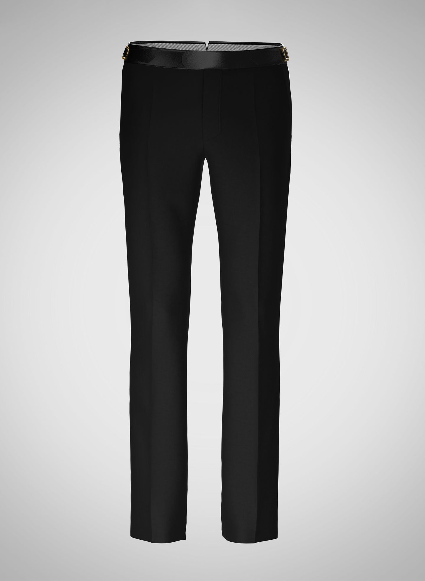 These black Tuxedo trousers from Dormeuil, is a fabric made from an innovative compact thread which results in a product with an excellent drape. Designed for every season of the year weighing 260 g/m. An all year appropriate fabric that will last you a lifetime. We suggest a white shirt for the complete look.