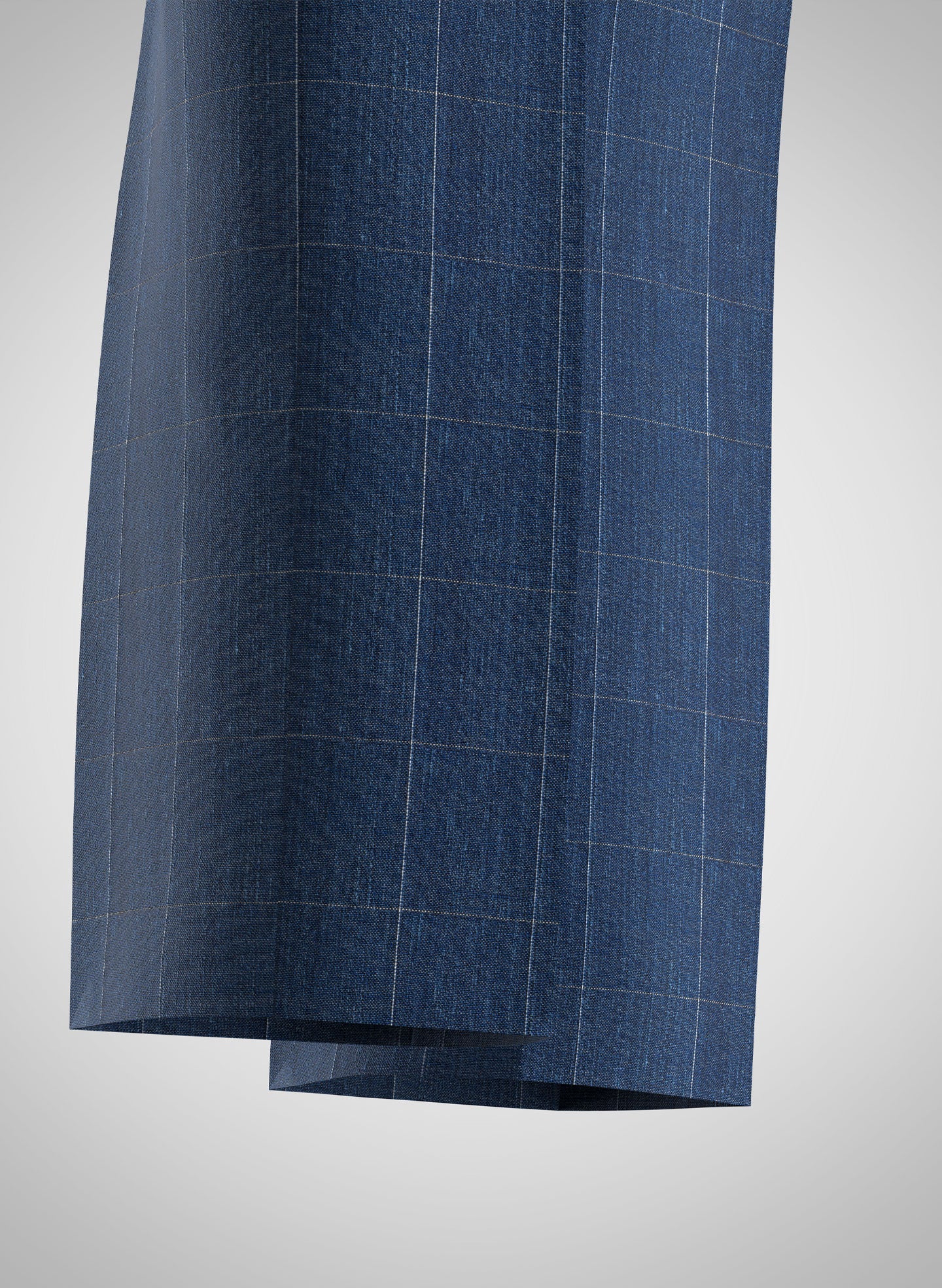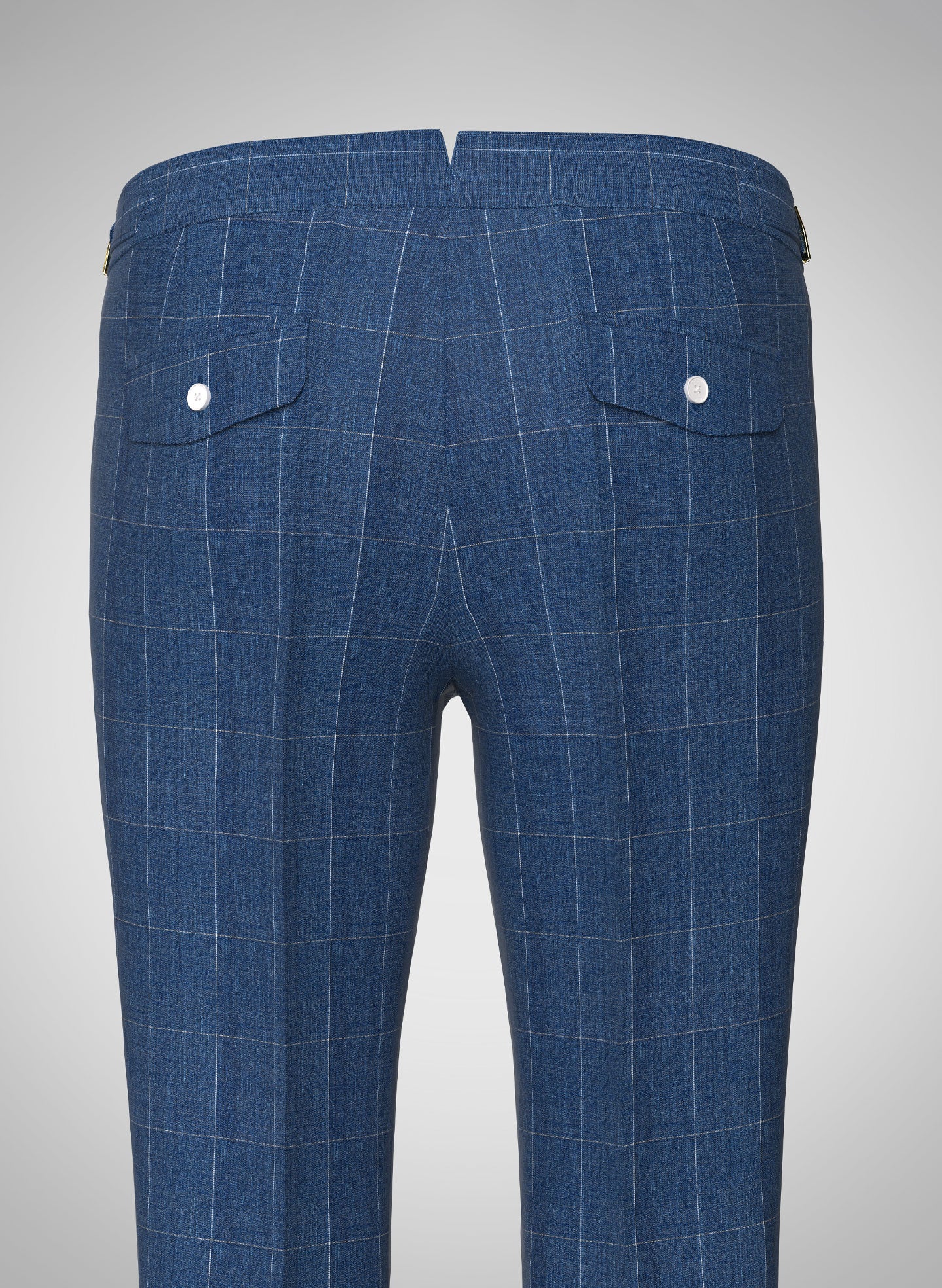 This blue checkered trousers from Solbiati, is a constructed fabric of 55% Linen 37% Wool 8% Silk. By bringing together the cool touch of linen, the moisture absorbing capabilities of wool and the lustre of silk the result is the most breathable fabric for suits weighing 250 g/m. A fabric that will last you a lifetime. We suggest a blue squared shirt for the complete look.