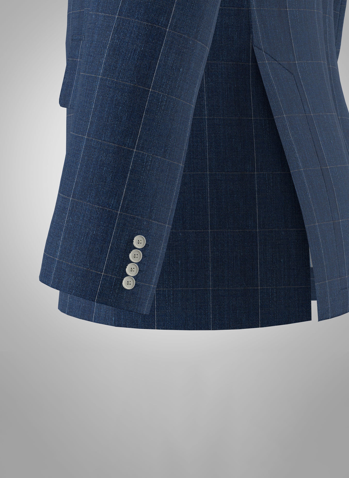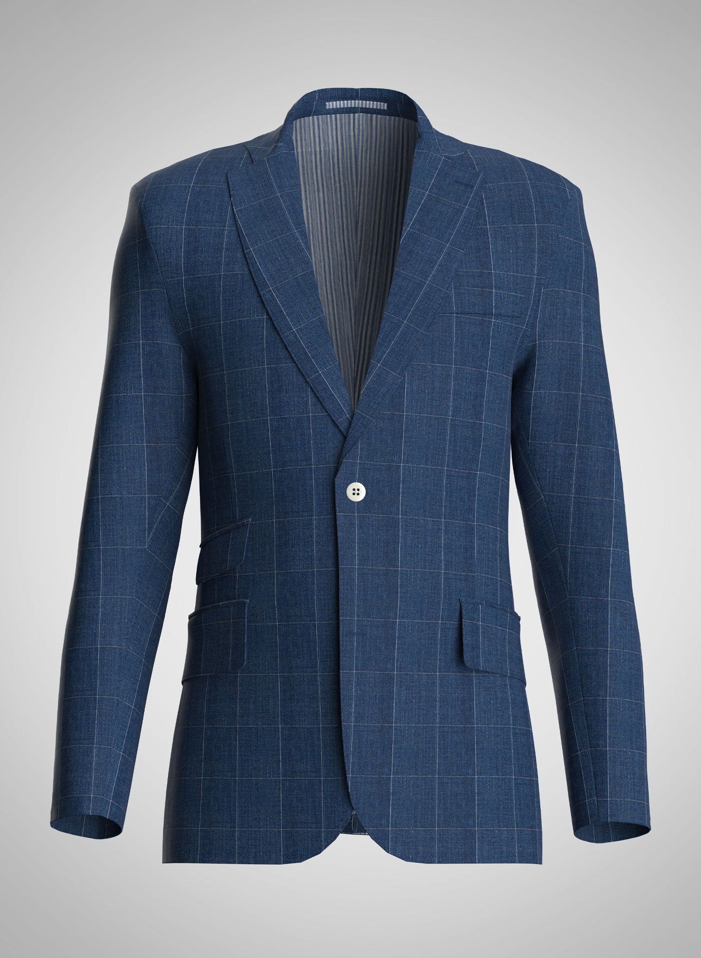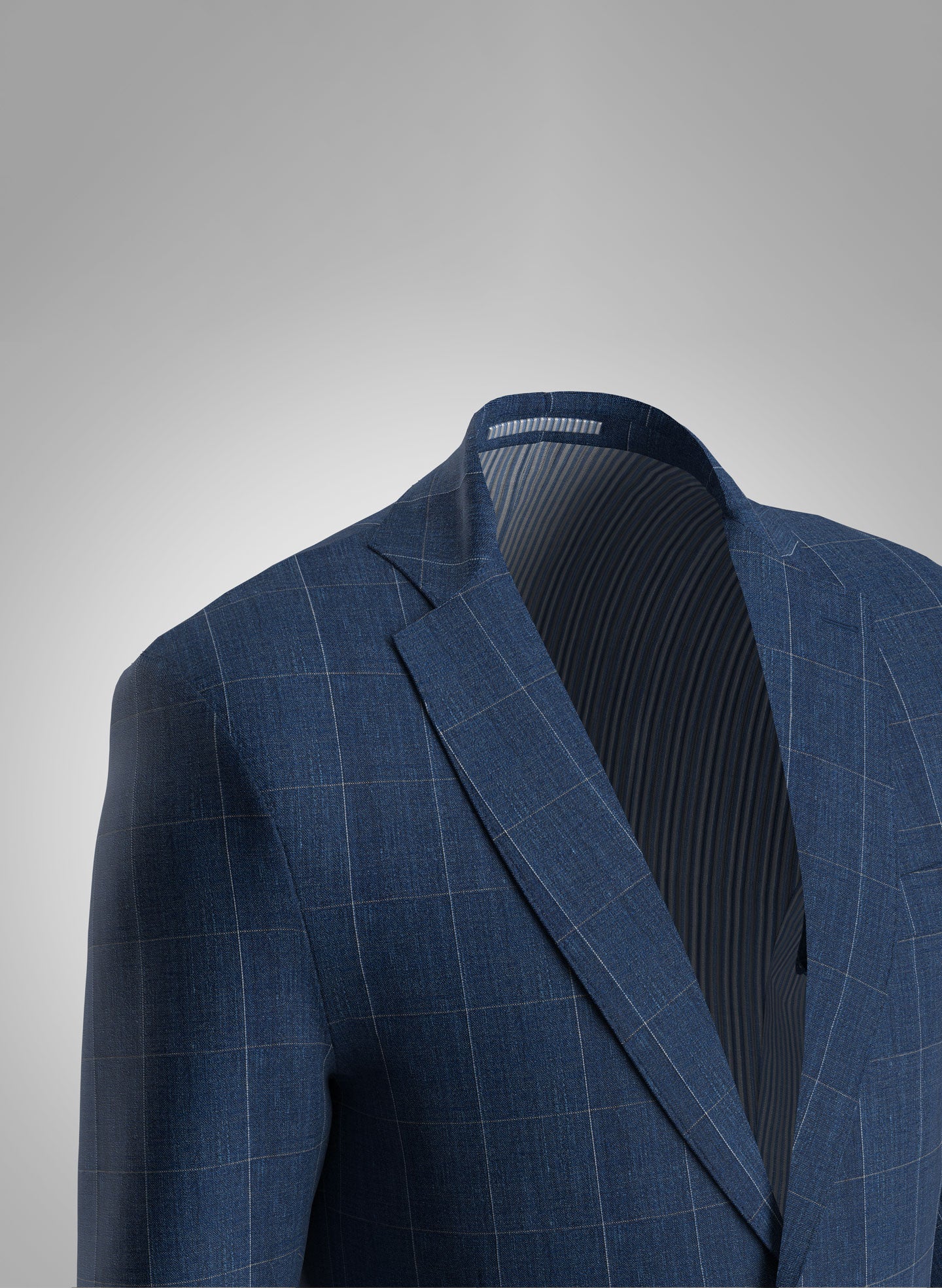 This blue striped jacket from Solbiati, is a constructed fabric of 55% Linen 37% Wool 8% Silk. By bringing together the cool touch of linen, the moisture absorbing capabilities of wool and the lustre of silk the result is the most breathable fabric for suits weighing 250 g/m. A fabric that will last you a lifetime. We suggest a blue shirt for the complete look.