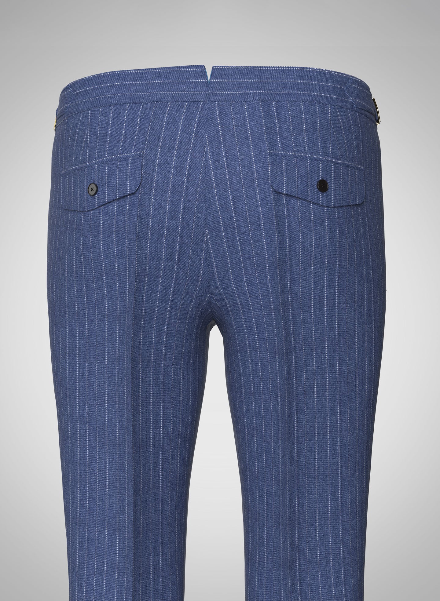 These blue striped trousers from Solbiati, is a constructed fabric of 100% Linen. This fabric of great character is perfect for creating versatile yet extremely refined garments weighing 340 g/m. A fabric that will last you a lifetime. We suggest a blue linen shirt for the complete look.