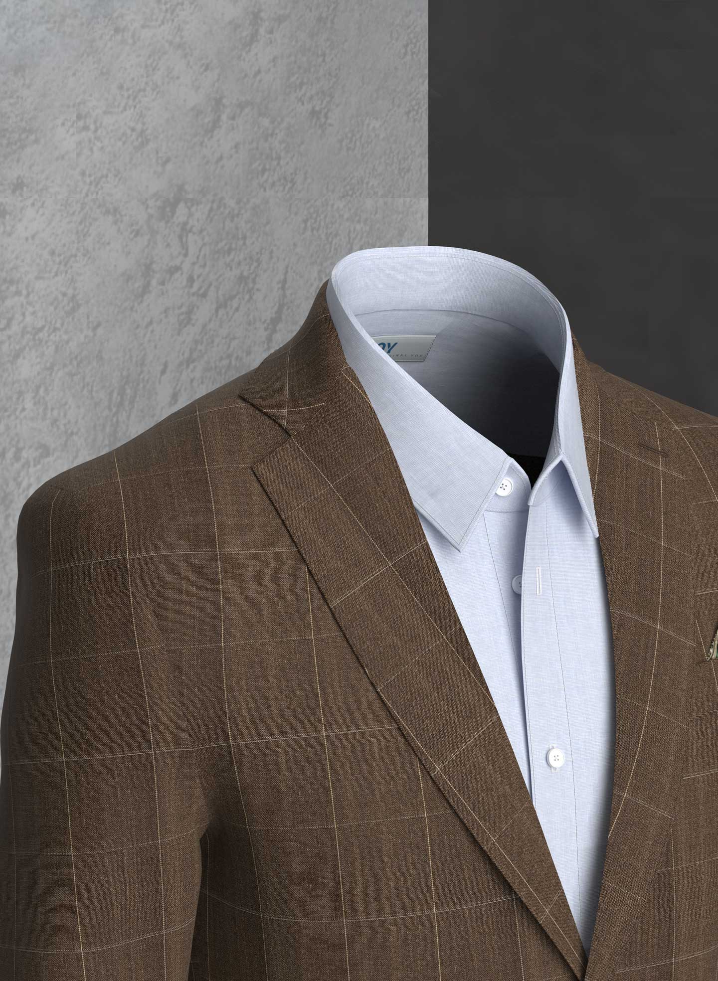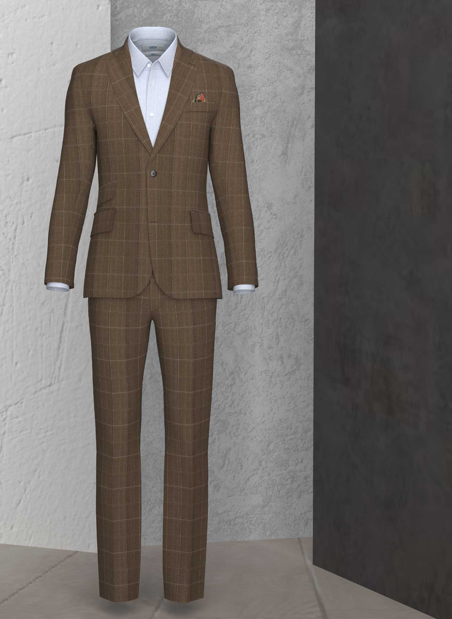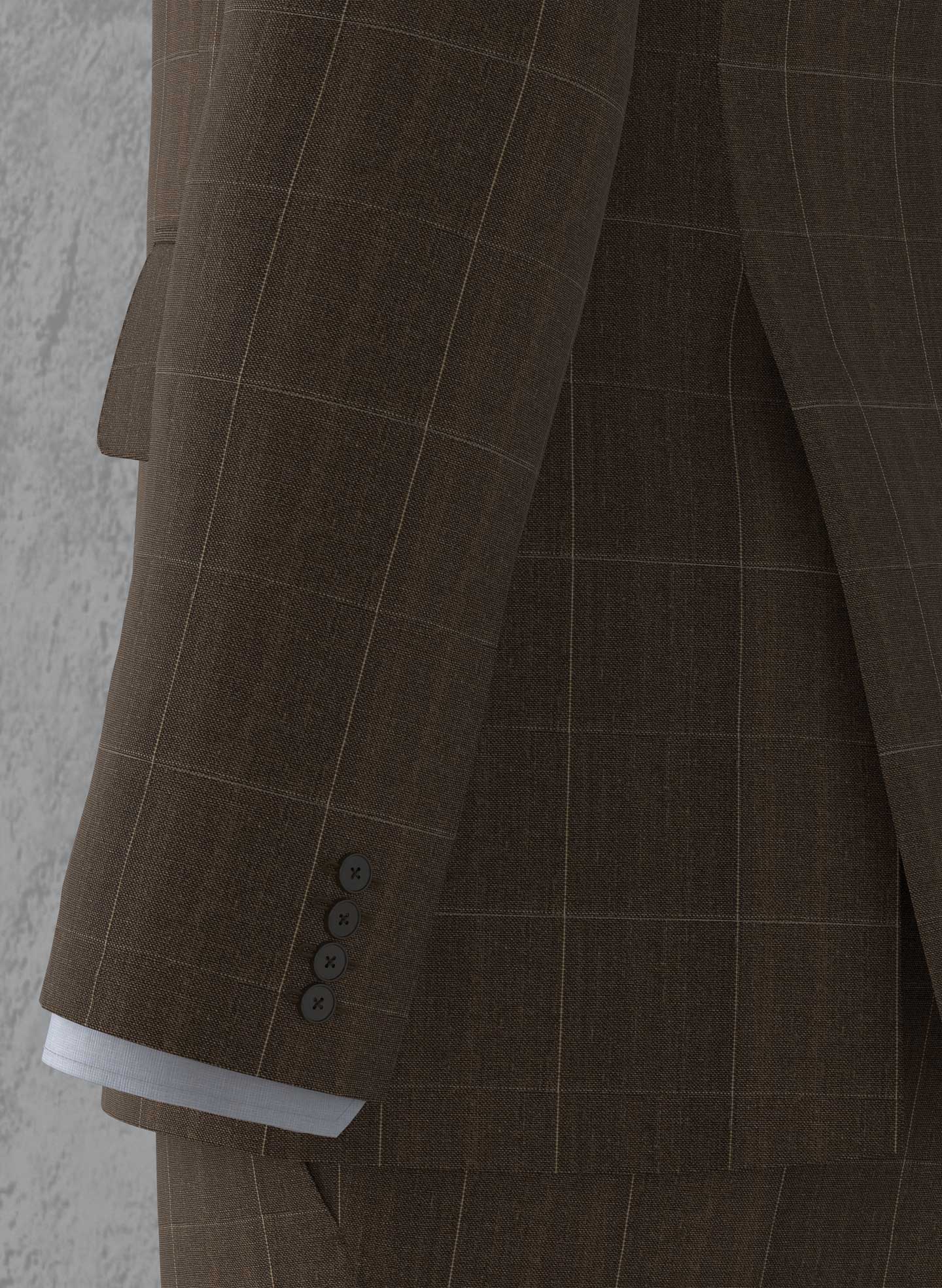 This brown checkered suit from Solbiati, is a constructed fabric of 55% Linen 37% Wool 8% Silk. By bringing together the cool touch of linen, the moisture absorbing capabilities of wool and the lustre of silk the result is the most breathable fabric for suits weighing 2500 g/m. A fabric that will last you a lifetime. We suggest yellow tassel loafers for the complete look.