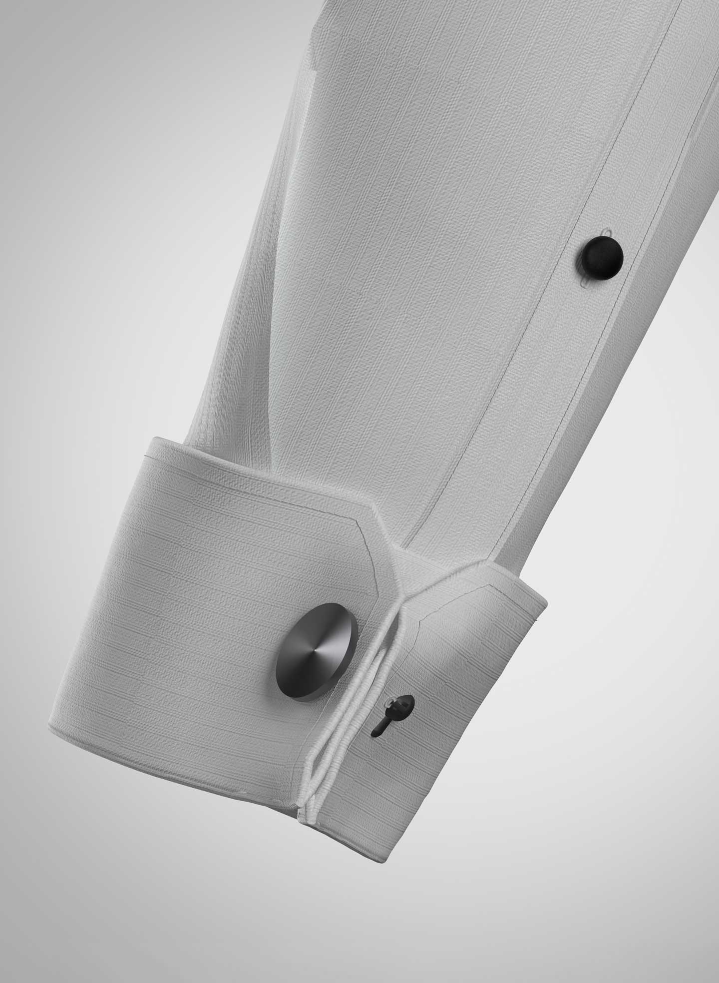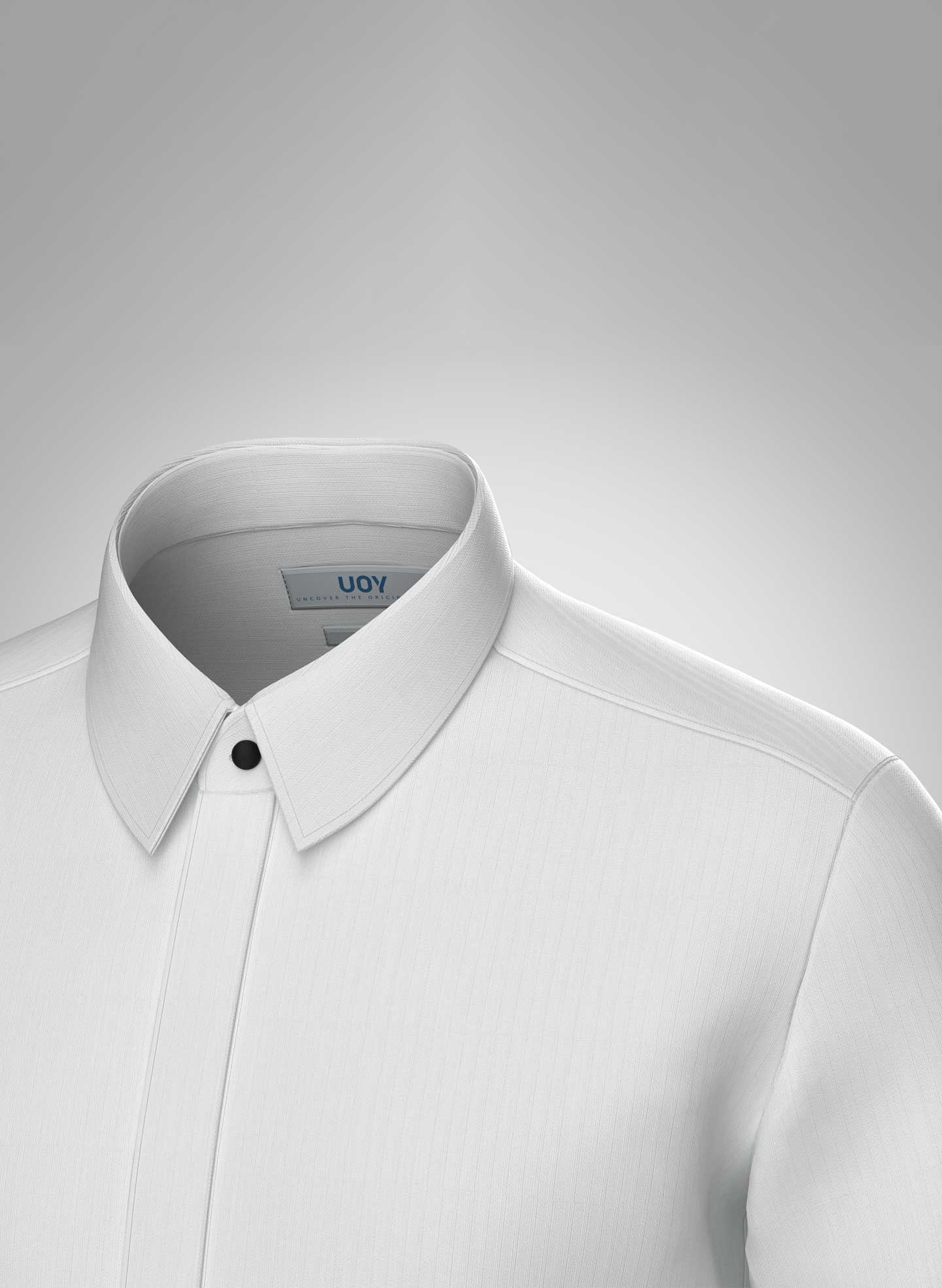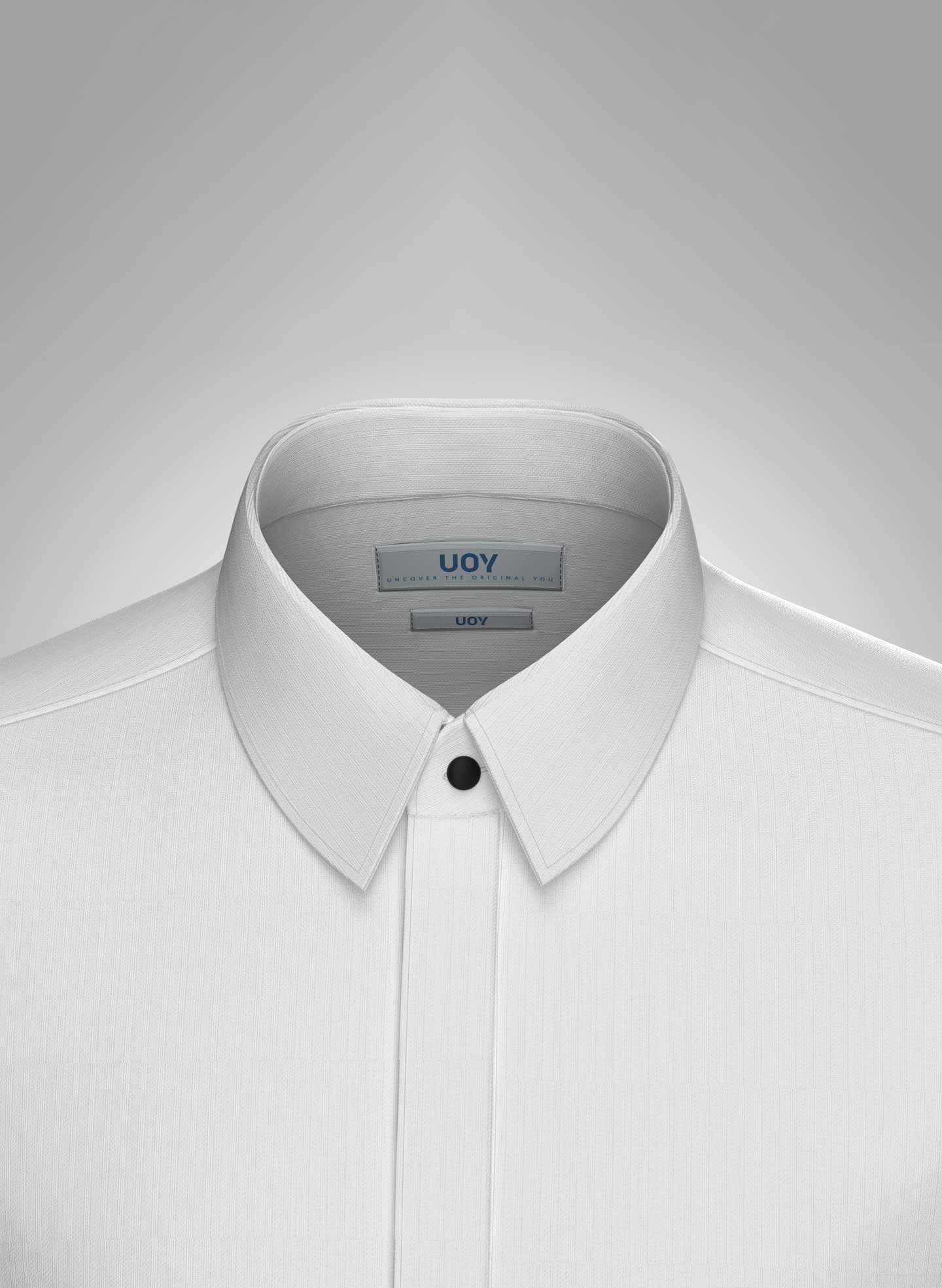 This white premium oxford shirt from Albini, with details such as Crowfoot stitchings, single needle seams and split yoke. This fabric comes with an easy iron finish to make sure the shirt stays crisp and clean. We suggest a black tuxedo for the complete look.