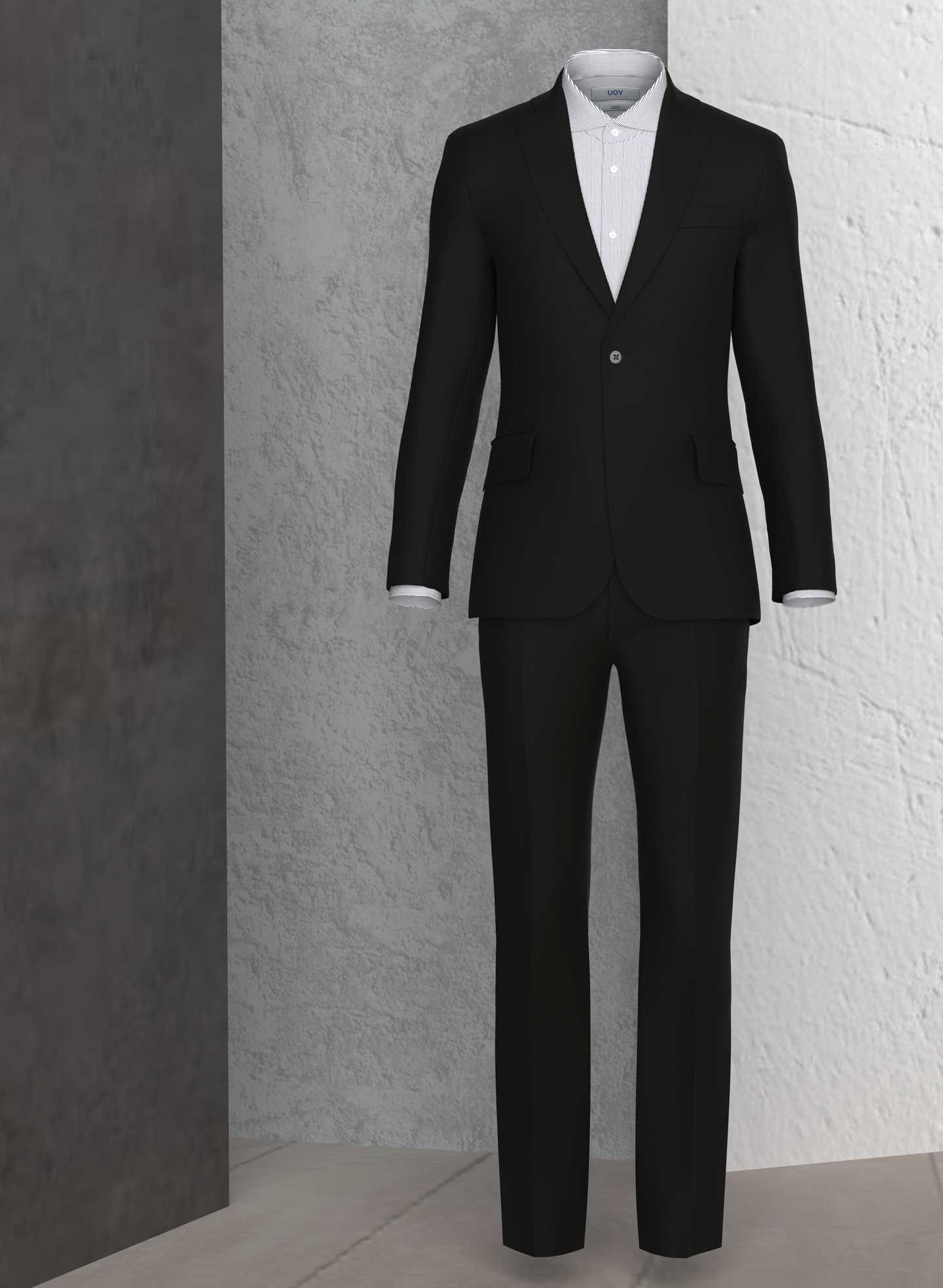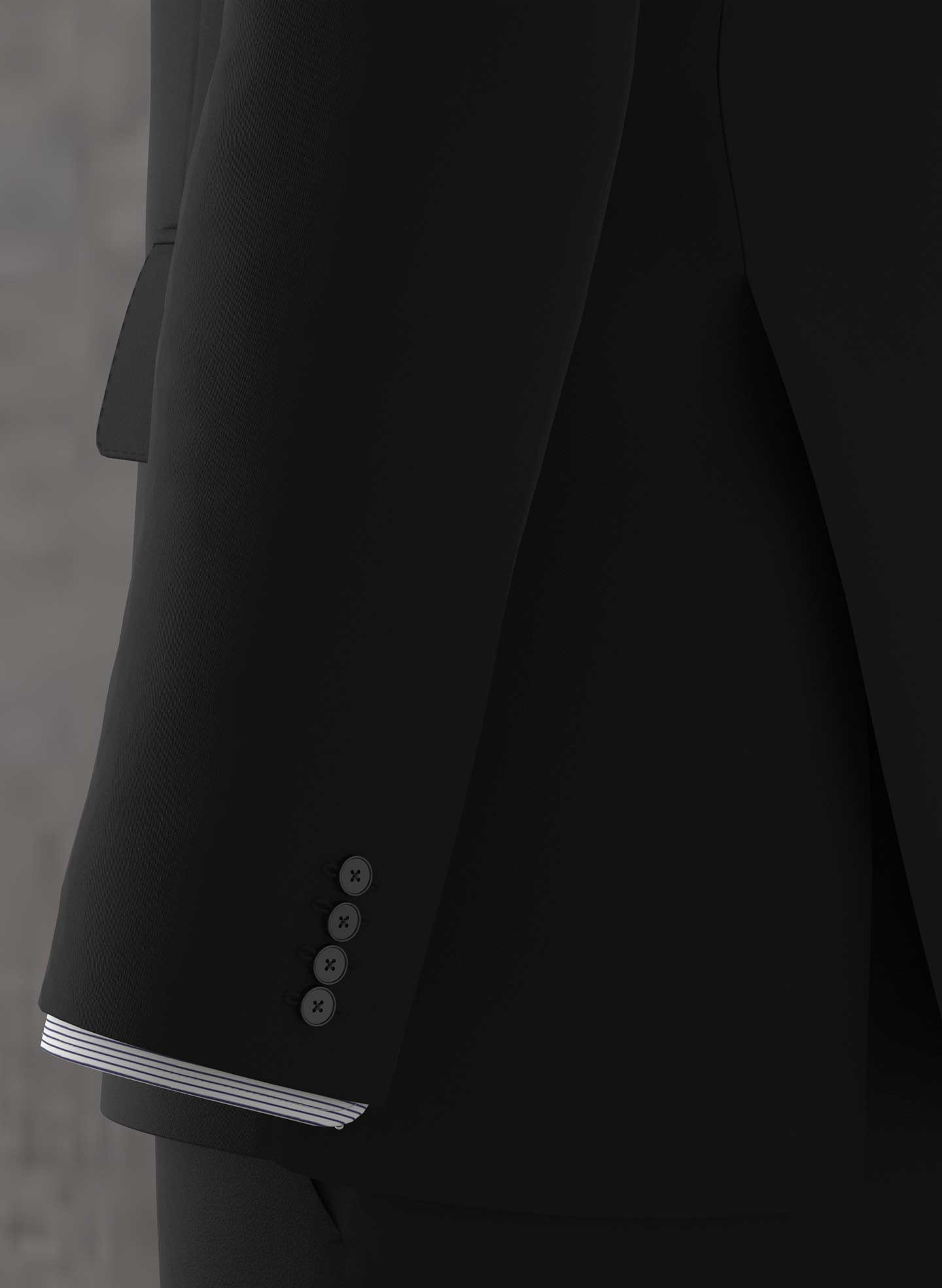 This black suit from Loro Piana, is a constructed fabric of 150'S Super Wool and is known to stand out for its comfort, breathability, fluidity and feather-light feeling weighing 250 g/m. An all year appropriate fabric that will last you a lifetime. We suggest Black Derby Shoes for the complete look.