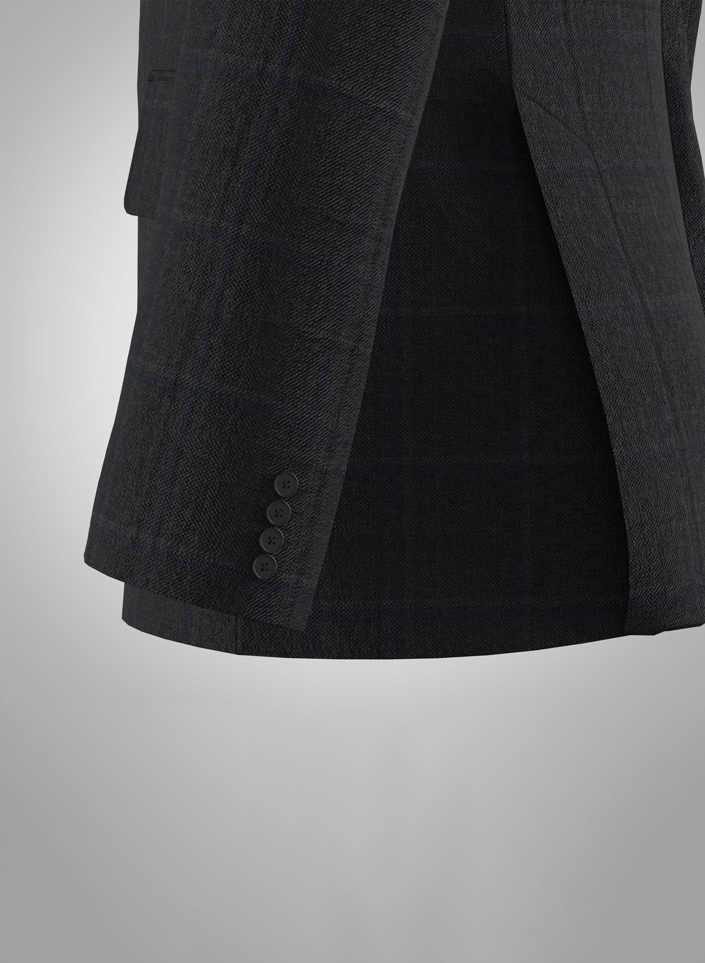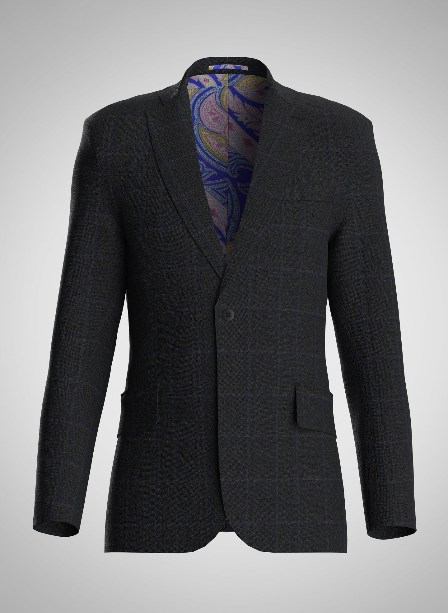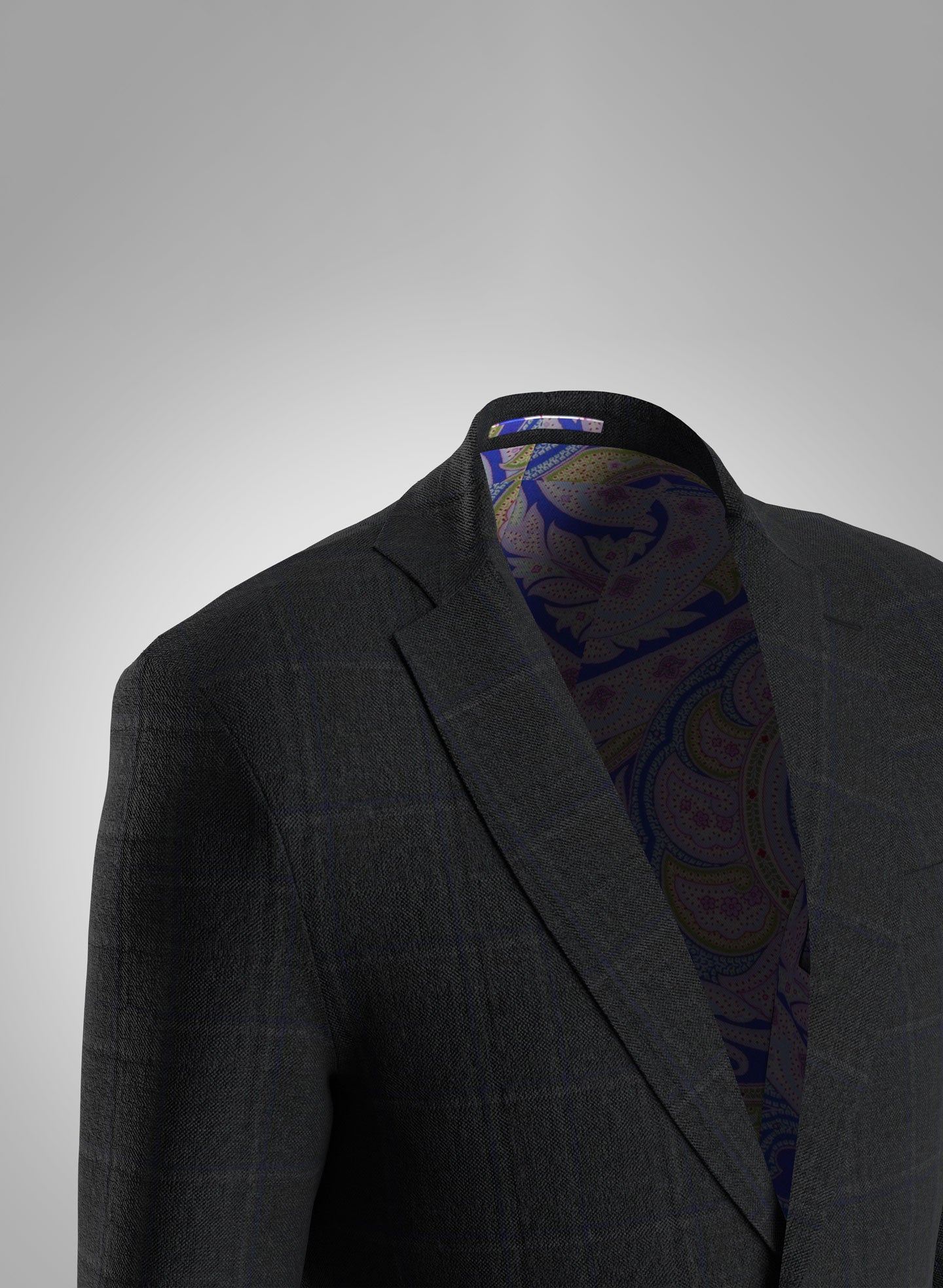 This dark grey checkered jacket from Dormeuil, is a high performance fabric made from pure Merino Wool. Designed for every season of the year weighing 300 g/m. An all year appropriate fabric that will last you a lifetime. We suggest a violet shirt for the complete look.