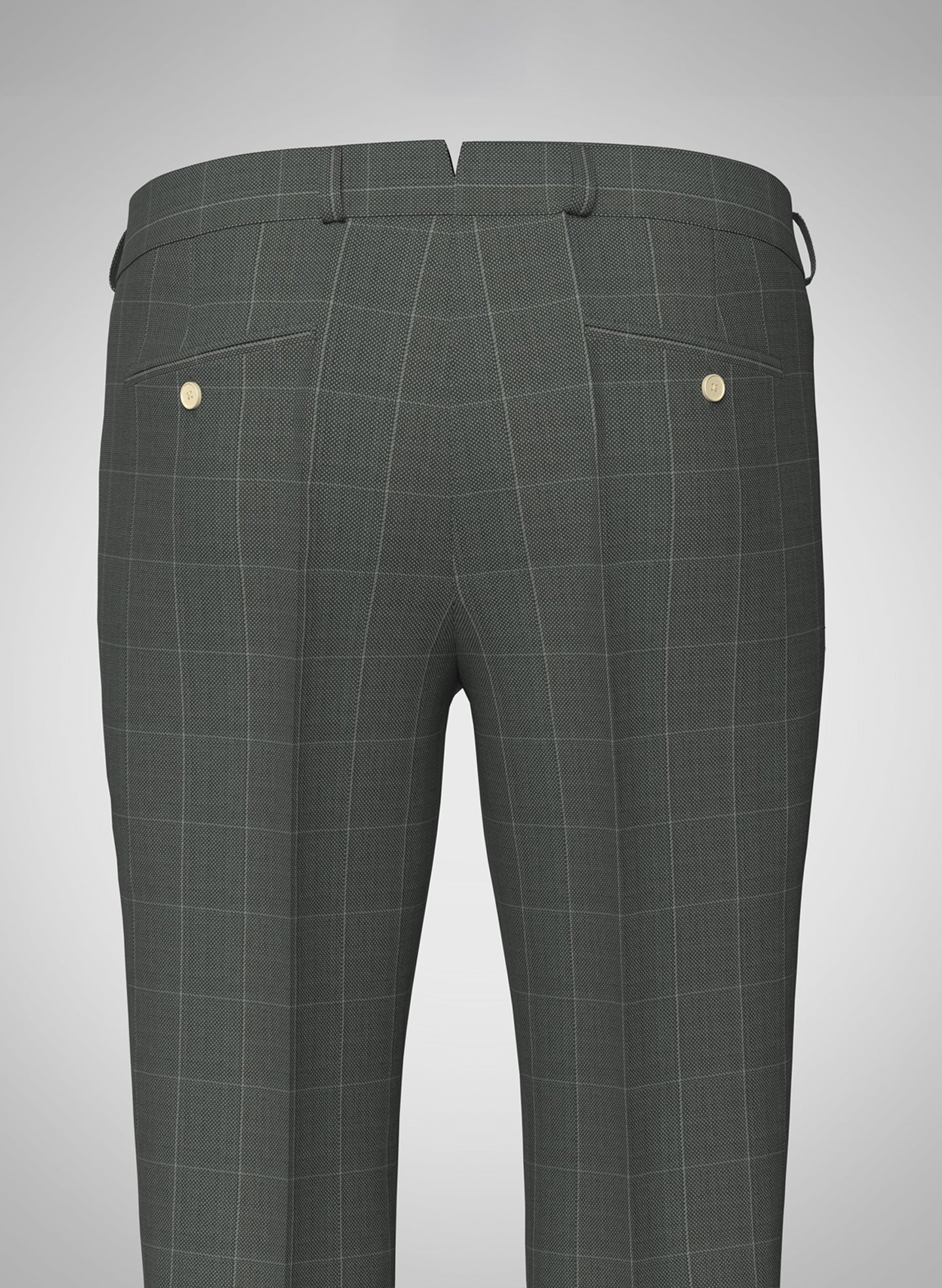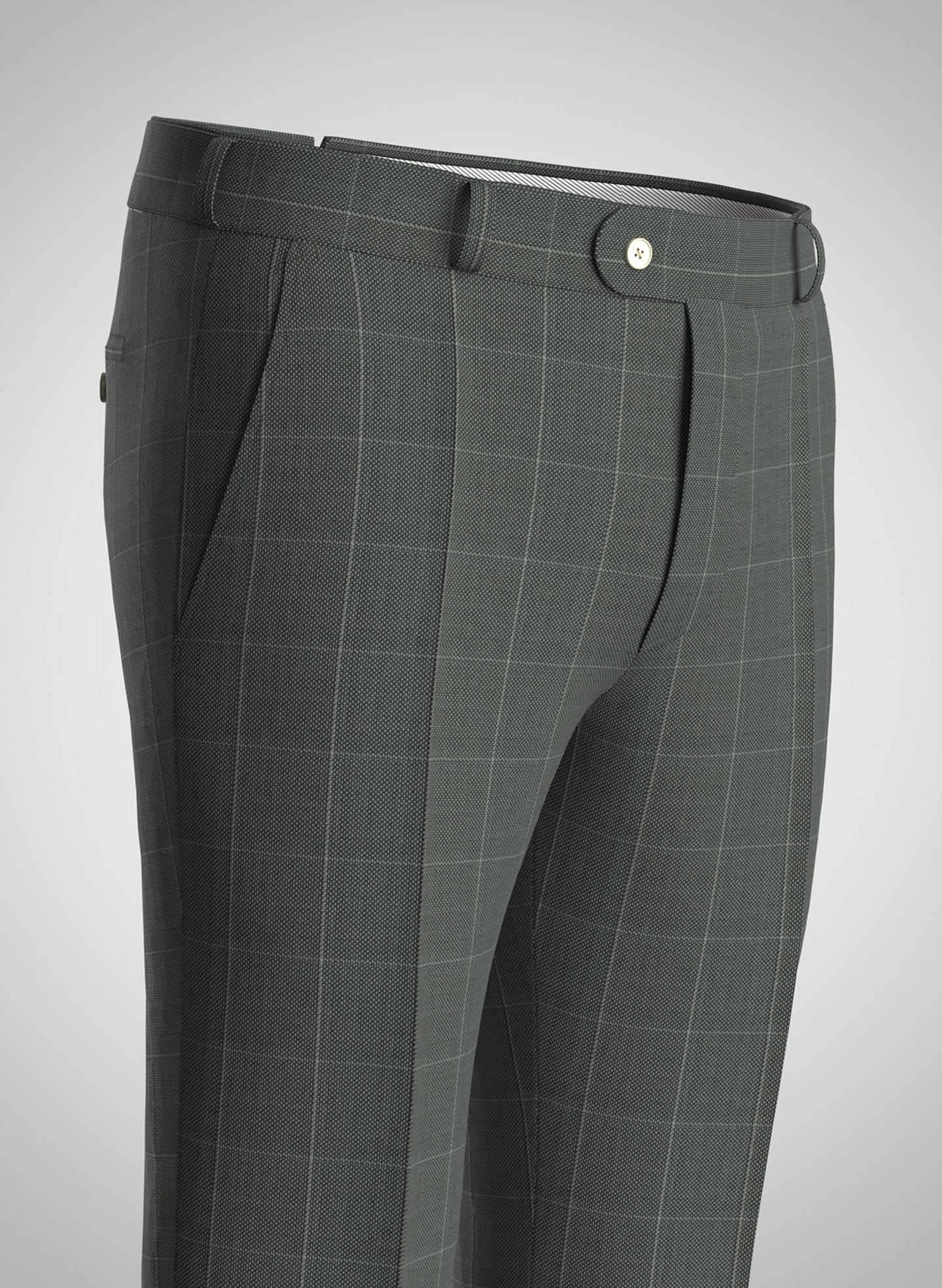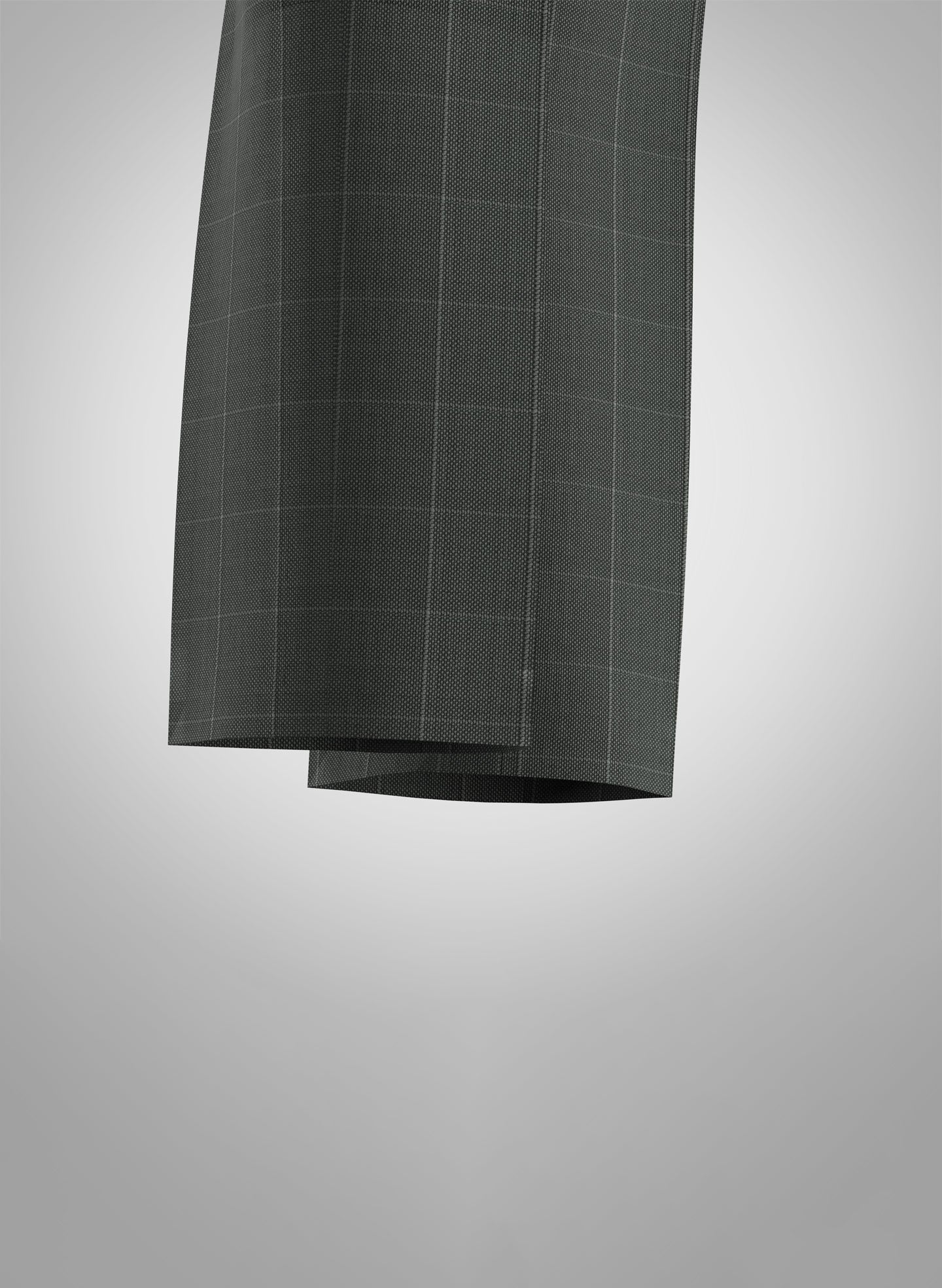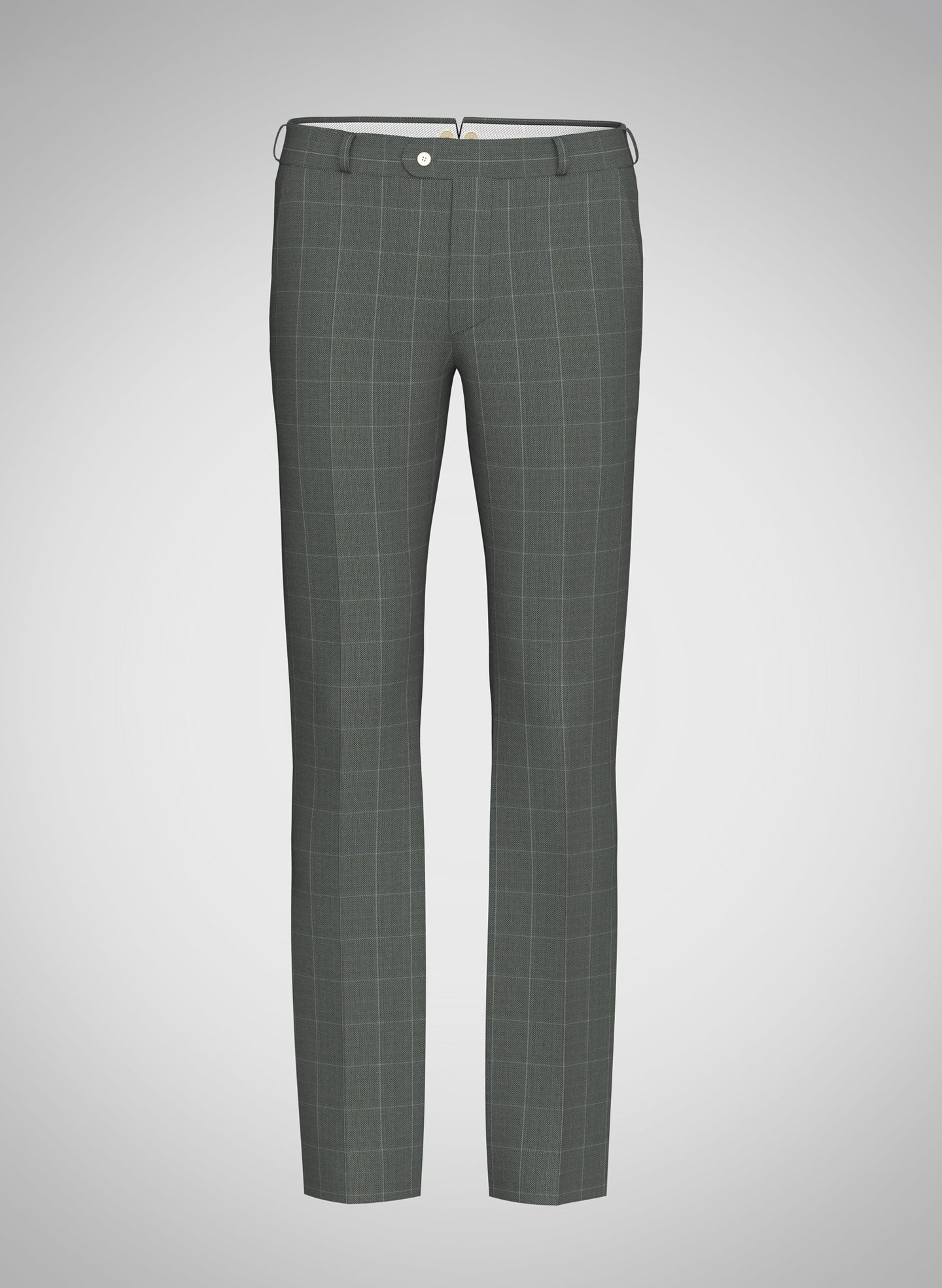 These grey checkered trousers from Dormeuil, is a fabric made from an innovative compact thread which results in a product with an excellent drape. Designed for every season of the year weighing 260 g/m. An all year appropriate fabric that will last you a lifetime. We suggest to combine with a squared dark blue shirt for the complete look.
