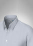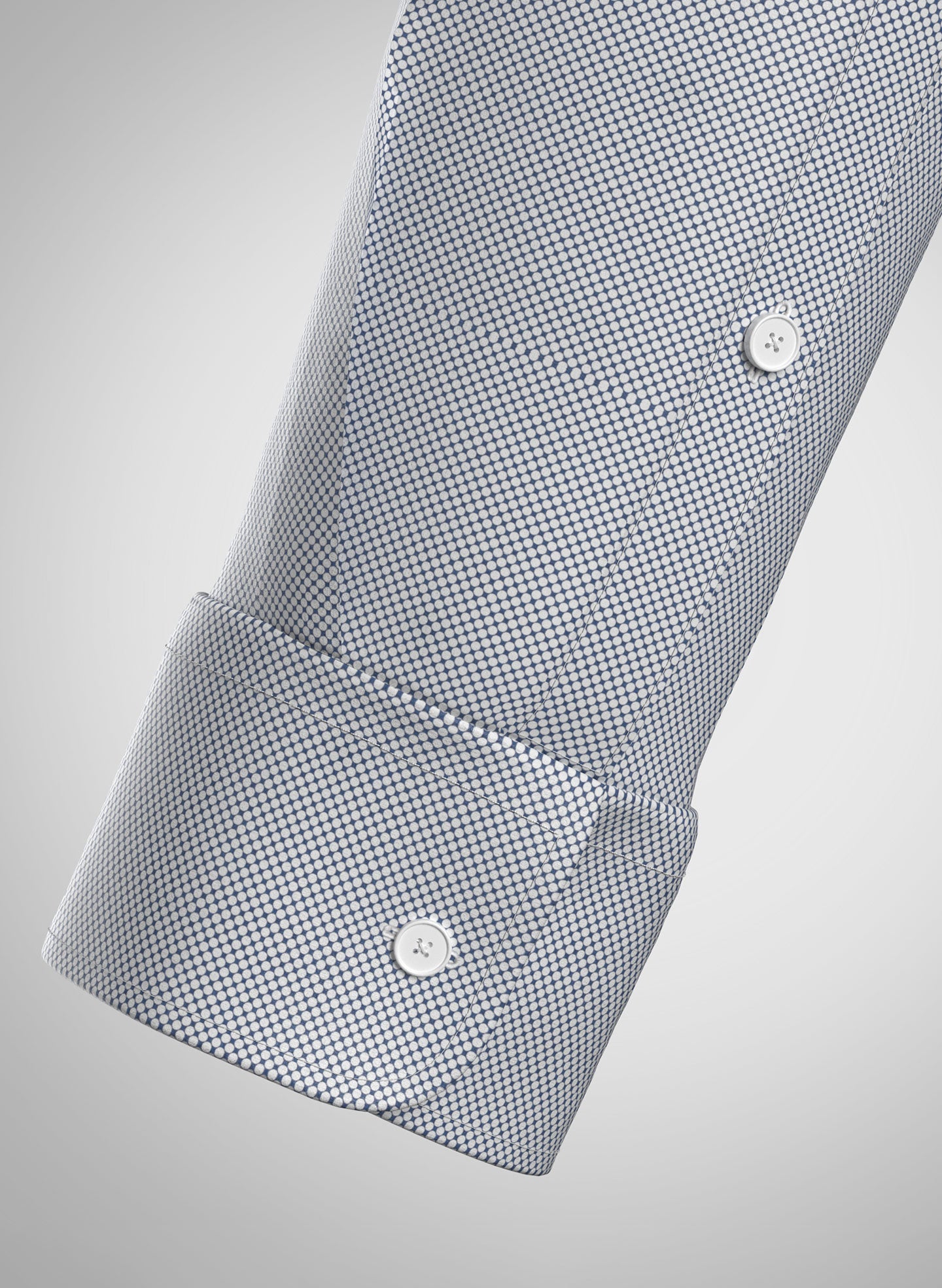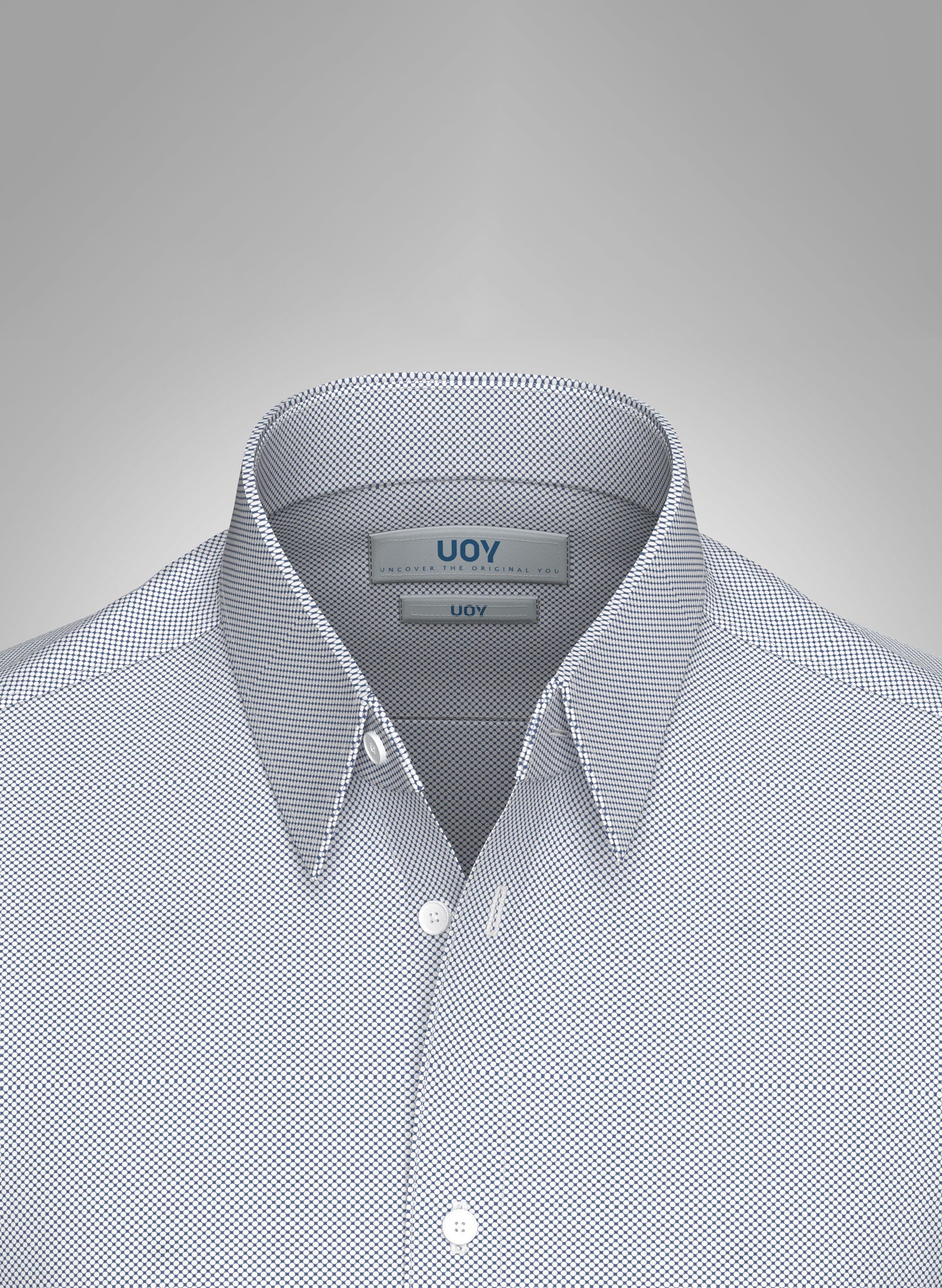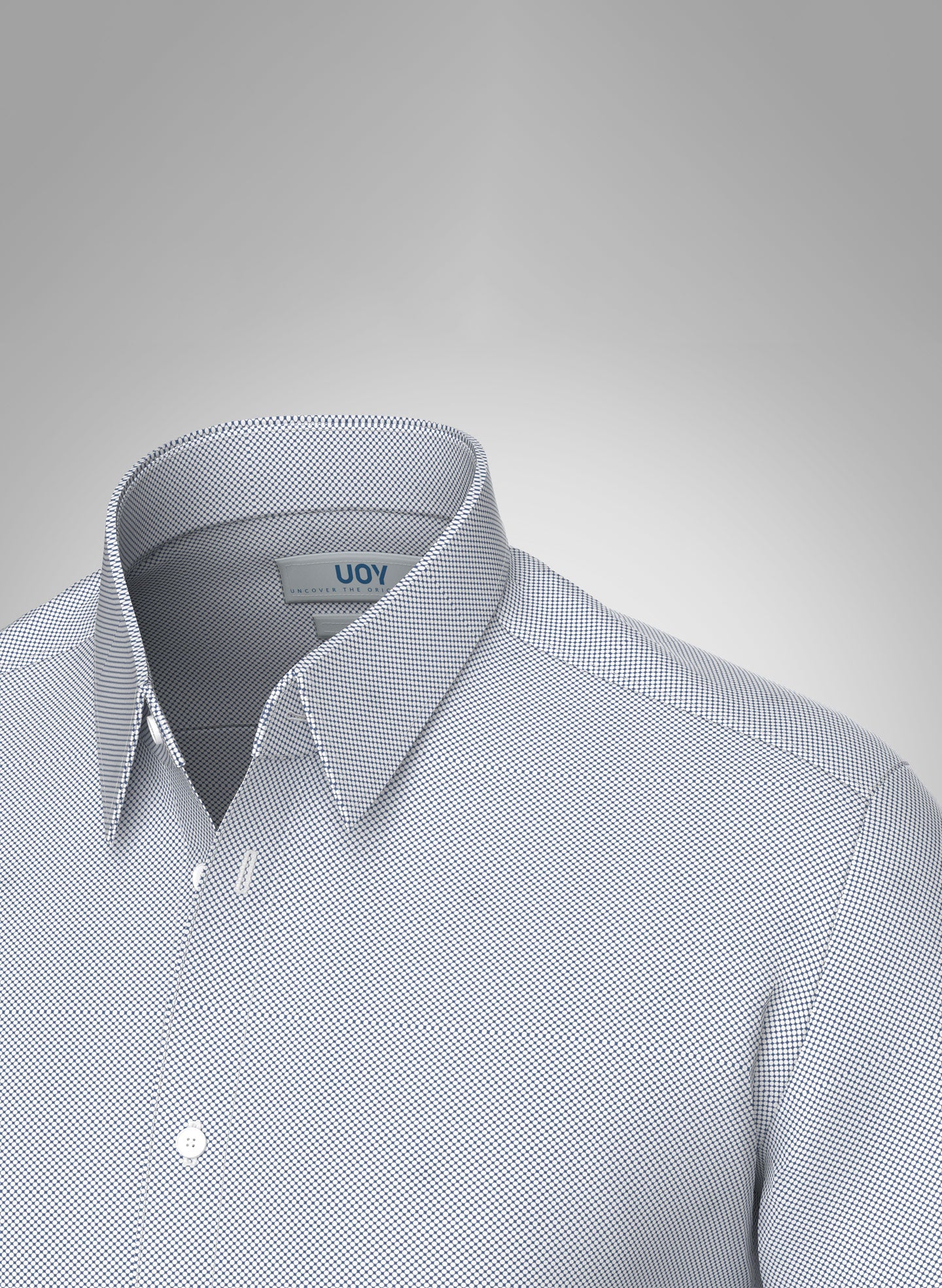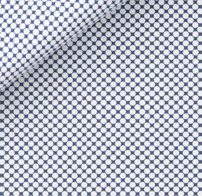 This blue dotted premium oxford shirt from Albini, with details such as Crowfoot stitchings, single needle seams and split yoke. This fabric comes with an easy iron finish to make sure the shirt stays crisp and clean. We suggest white linen trousers for the complete look.
