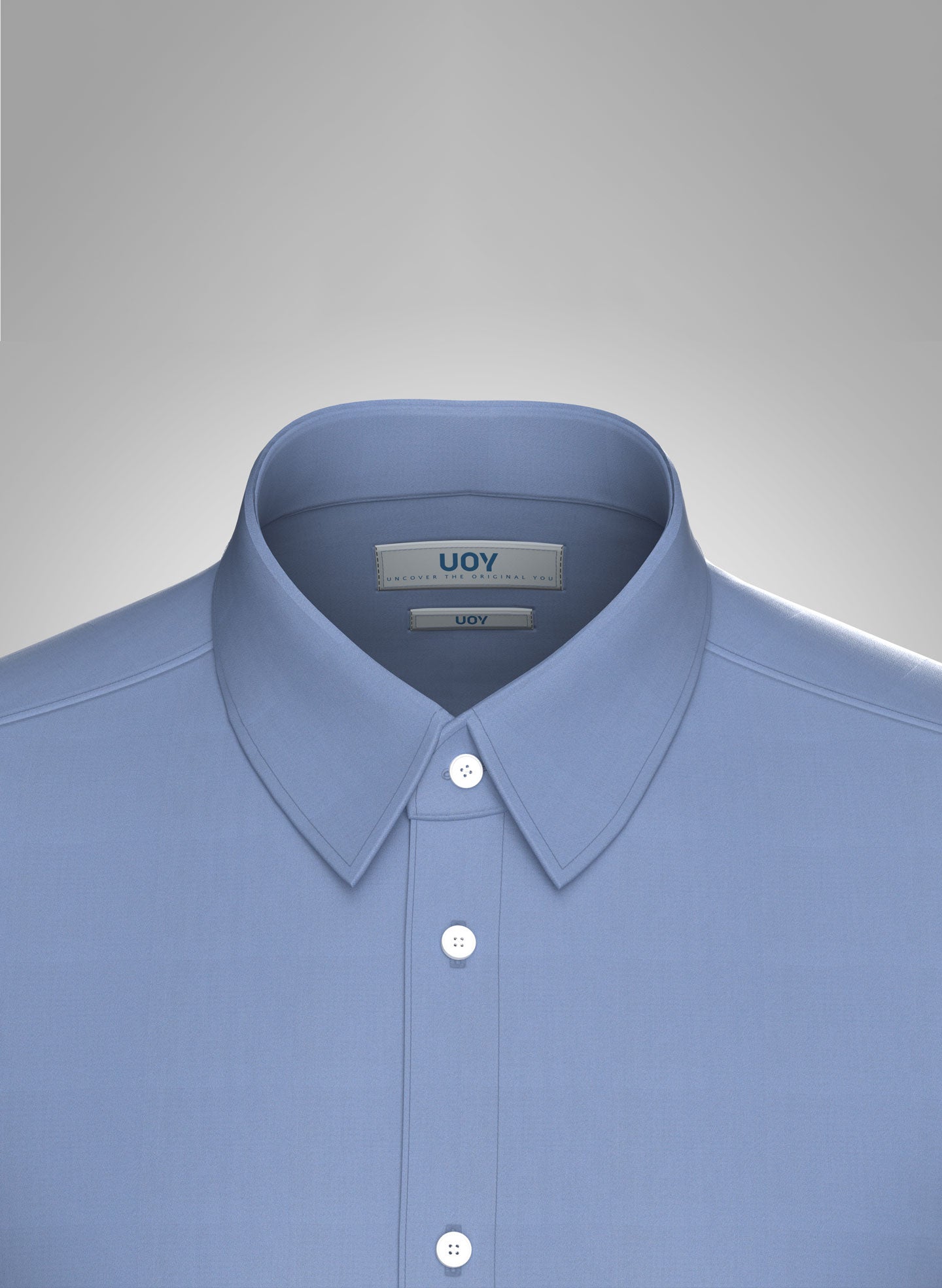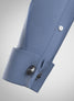 This blue Albini shirt is smooth and crisp in texture and its characteristic long staple yarns create a silky yet strong surface. It is tightly woven with fine yarns using a simple over and under weave pattern weighing 106 grm. We suggest beige trousers for the complete look.