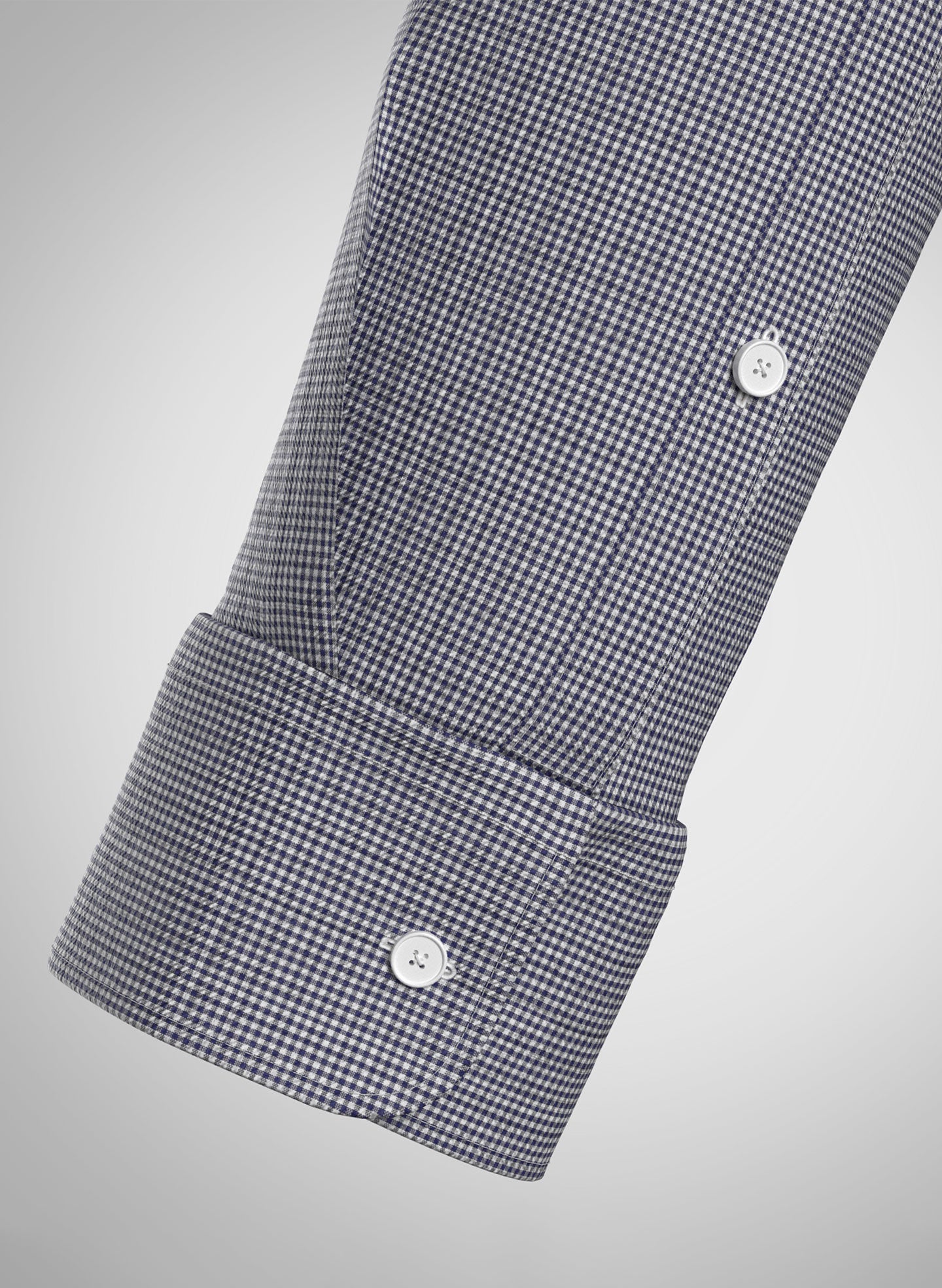 This dark blue checkered premium oxford shirt from Albini, with details such as Crowfoot stitchings, single needle seams and split yoke. This fabric comes with an easy iron finish to make sure the shirt stays crisp and clean. We suggest grey trousers for the complete look.