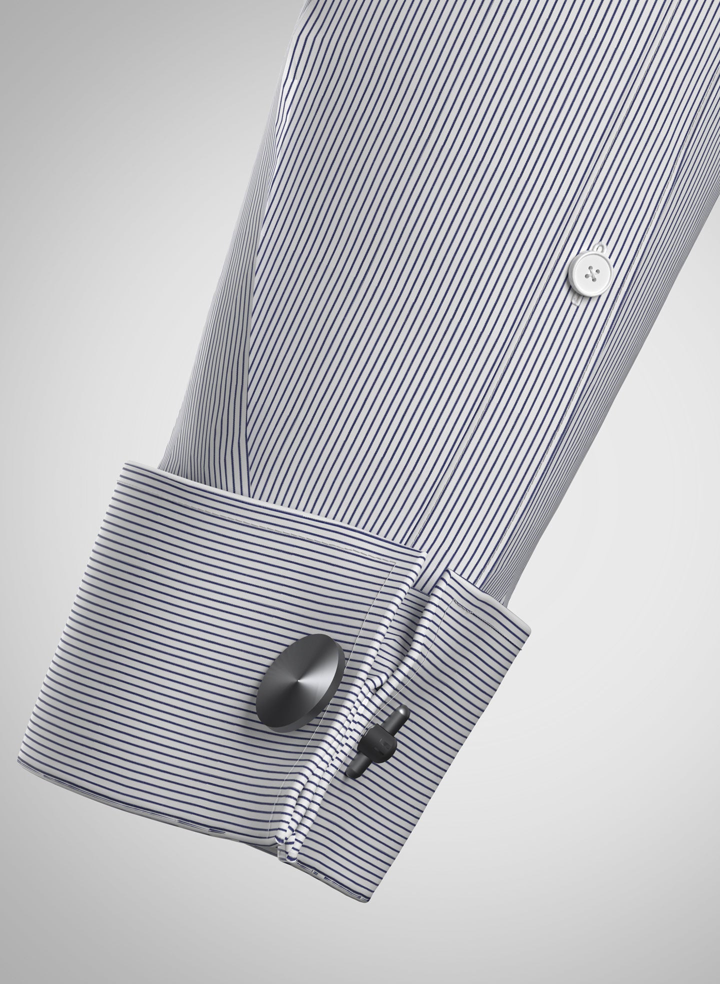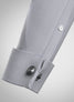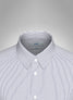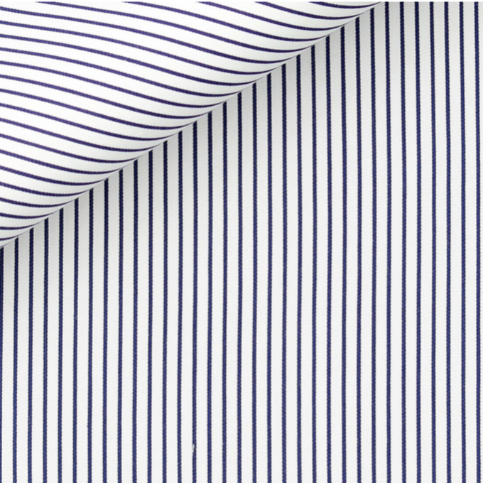 This white striped Albini satin shirt is smooth and crisp in texture and its characteristic long staple yarns create a silky yet strong surface. It is tightly woven with fine yarns using a simple over and under weave pattern weighing 106 grm. We suggest grey trousers for the complete look.