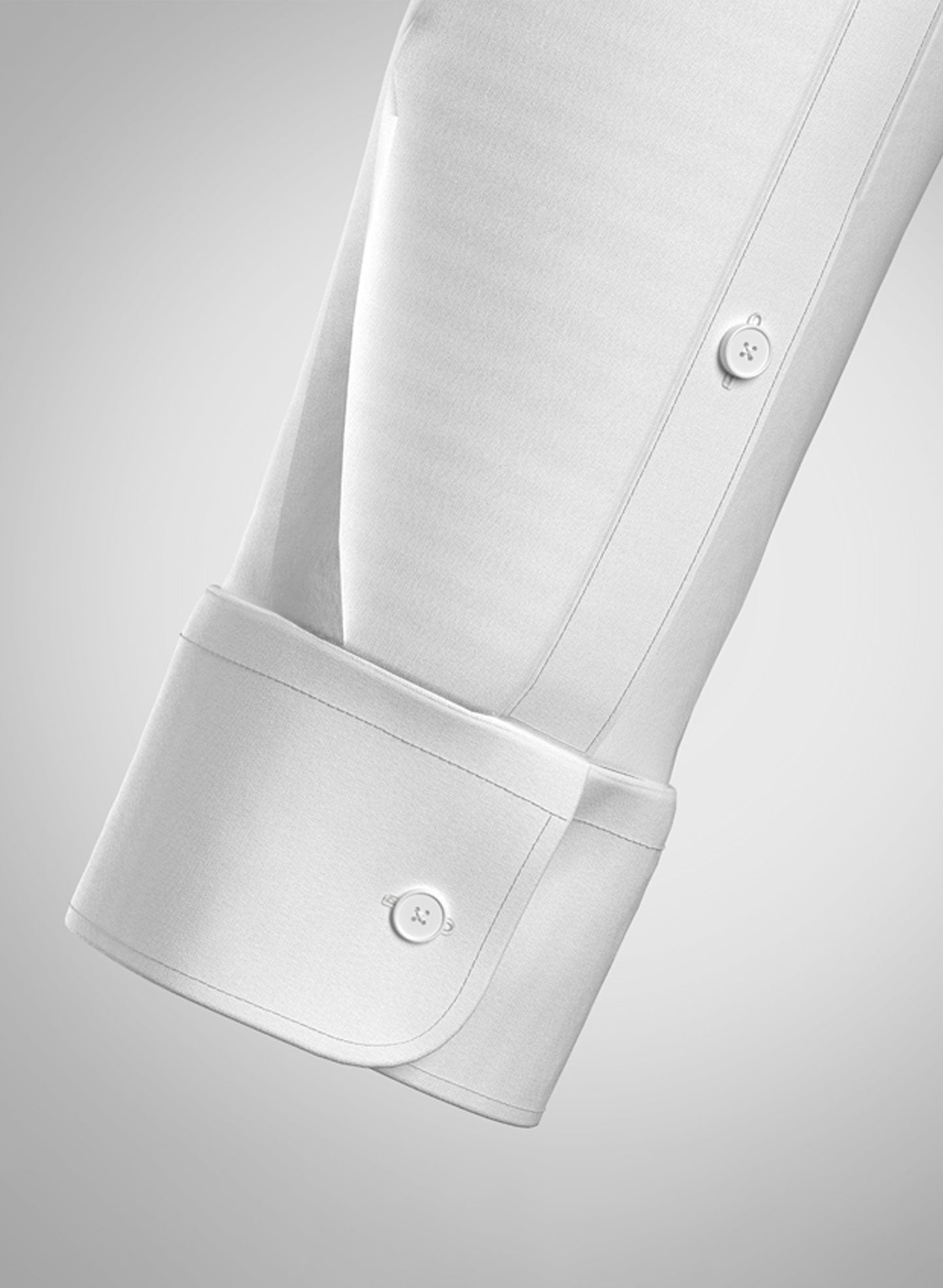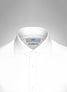 This white Albini poplin shirt is smooth and crisp in texture and its characteristic long staple yarns create a silky yet strong surface. It is tightly woven with fine yarns using a simple over and under weave pattern weighing 106 grm. We suggest a blue suit for the complete look.